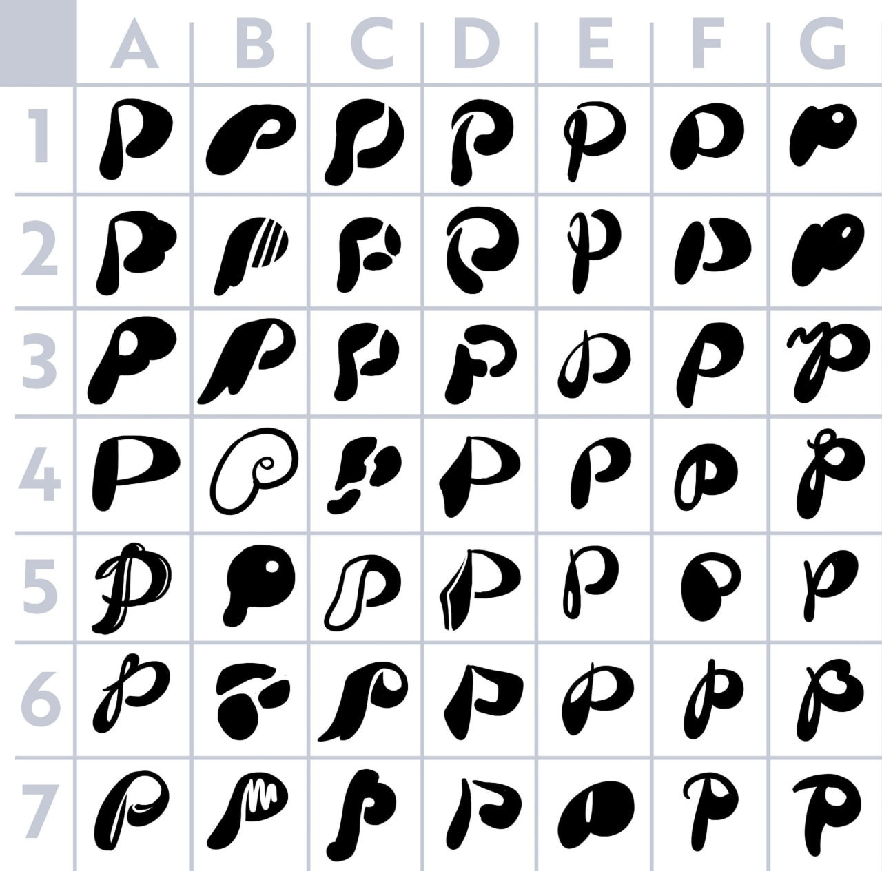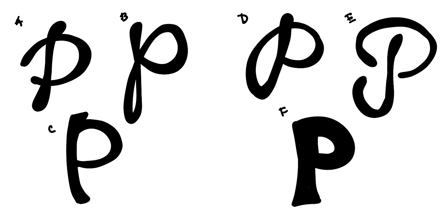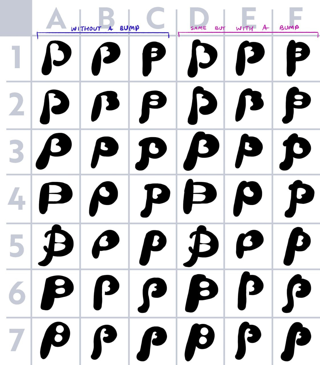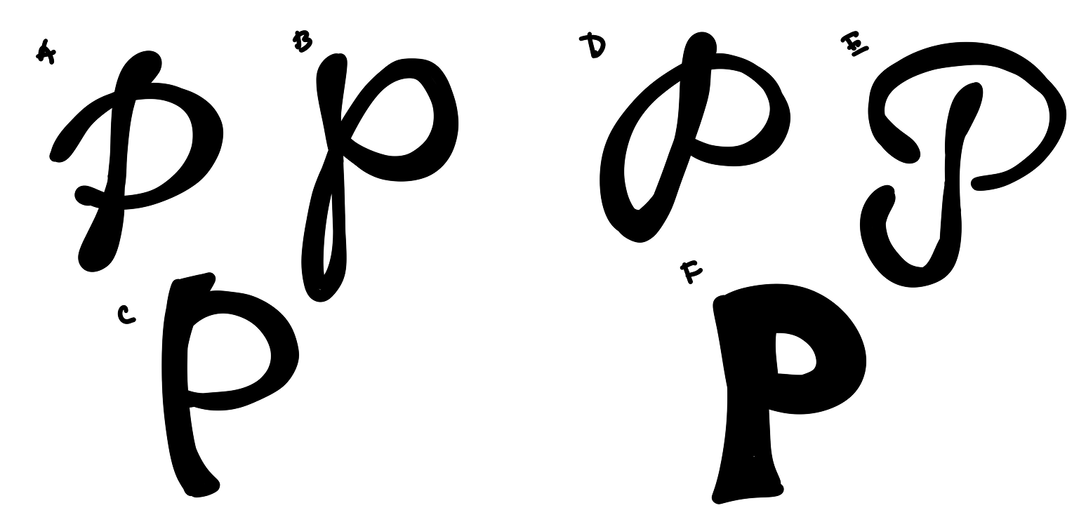 From here, we really liked the thicker, curved Ps (many of the options in column A). A few of these images started incorporating a B into the P (2A, 3A, 6G), which inspired Jennifer to sketch this concept: