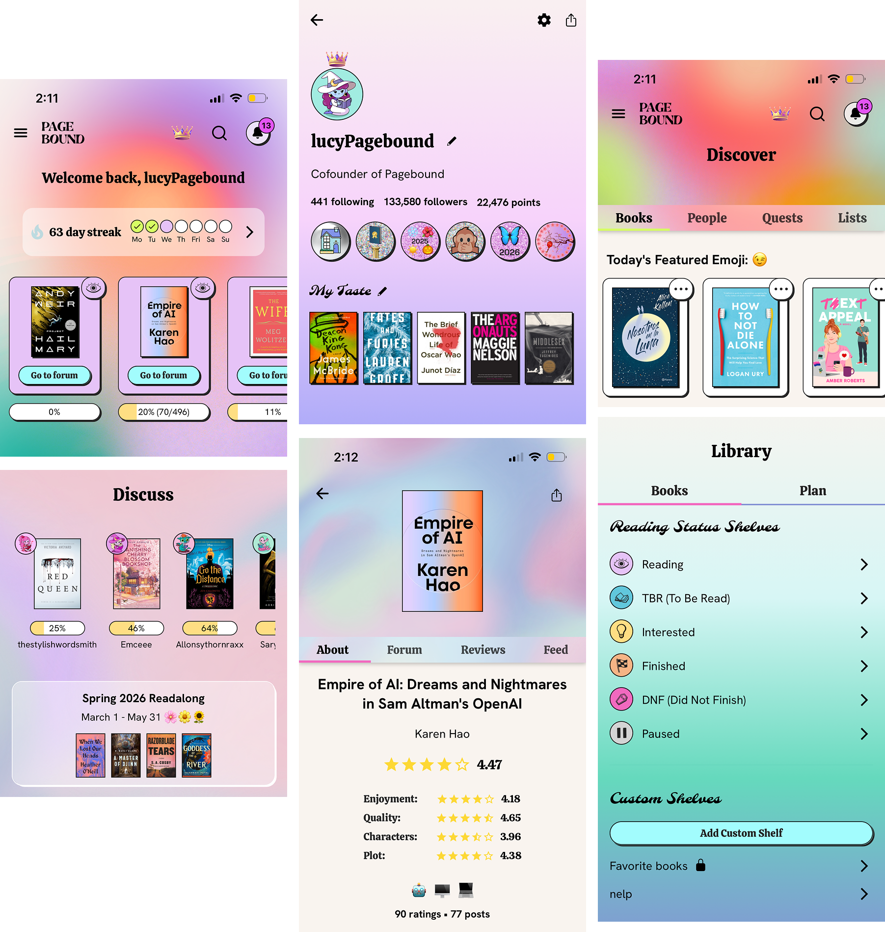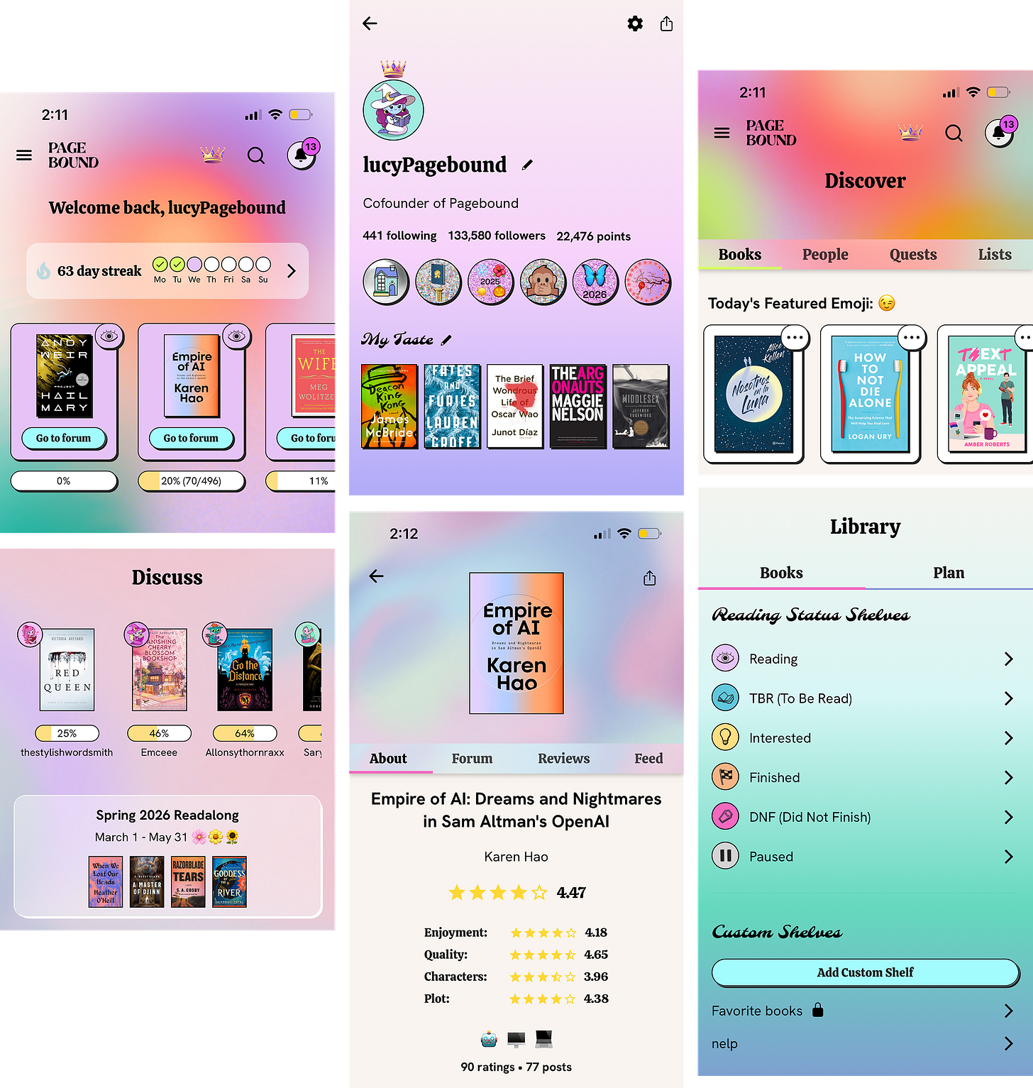 Here you see the signature blue of our book forums and our stark drop shadow. We launched on web first and wanted to stand apart, at a glance, from the sea of beige book tracking platforms. We found an affinity with the neobrutalism design style, itself a reaction against the predictable look of modern minimalism. At the time, as a self-taught designer, I didn’t have the language for our aesthetic. I just knew the vibe it produced: nostalgic old-internet, rebellious and bold, whimsical and cozy.